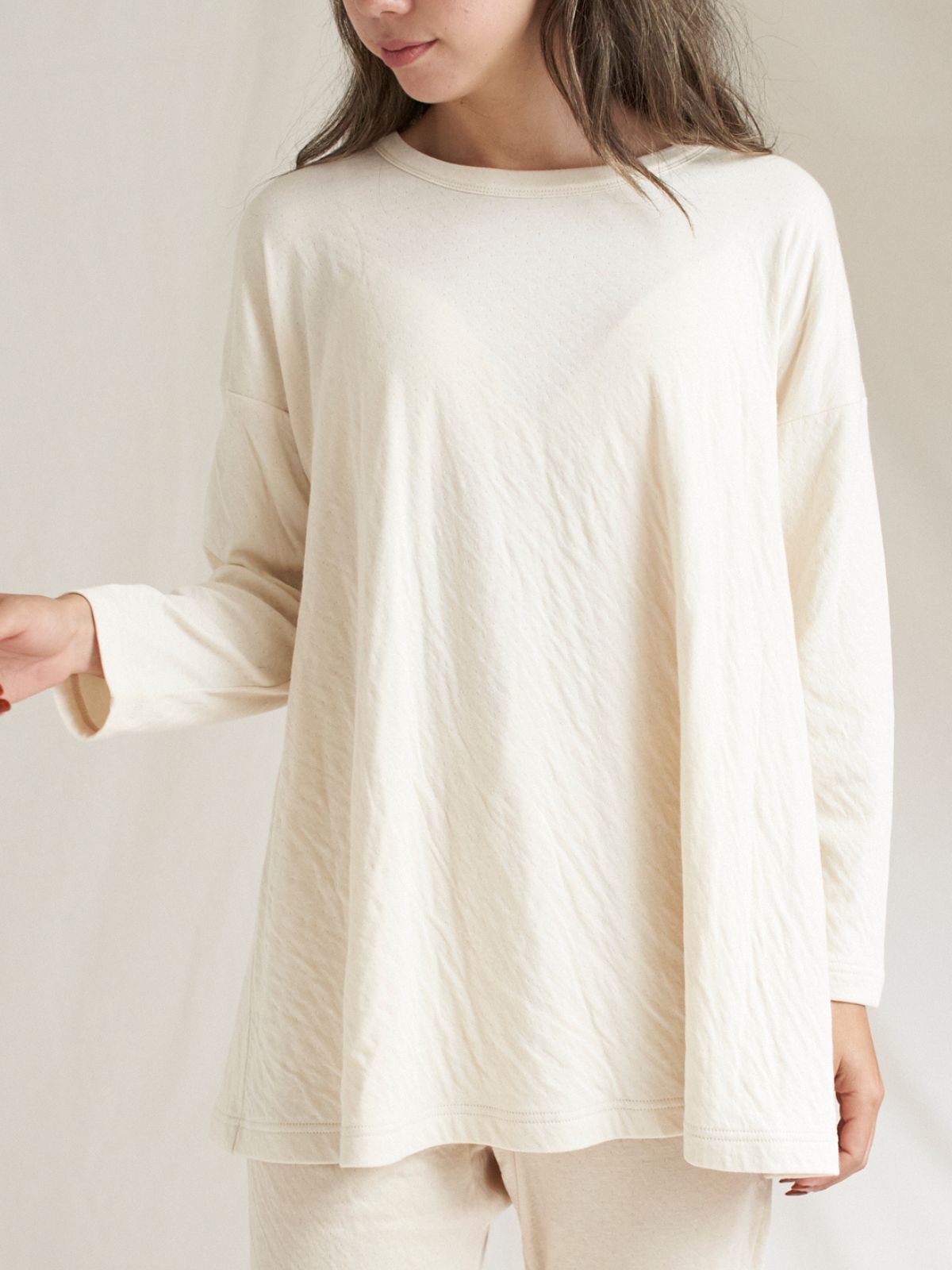 薄手で軽やか、ふわっとやわらかな生地が特徴のファインニットシリーズ。空気をはらんで温かく、かつ通気性も良いので、オールシーズン気持ちよく着ていただけます。この冬は新作の腹巻き付きレギンスとの着合わせが特におすすめです。