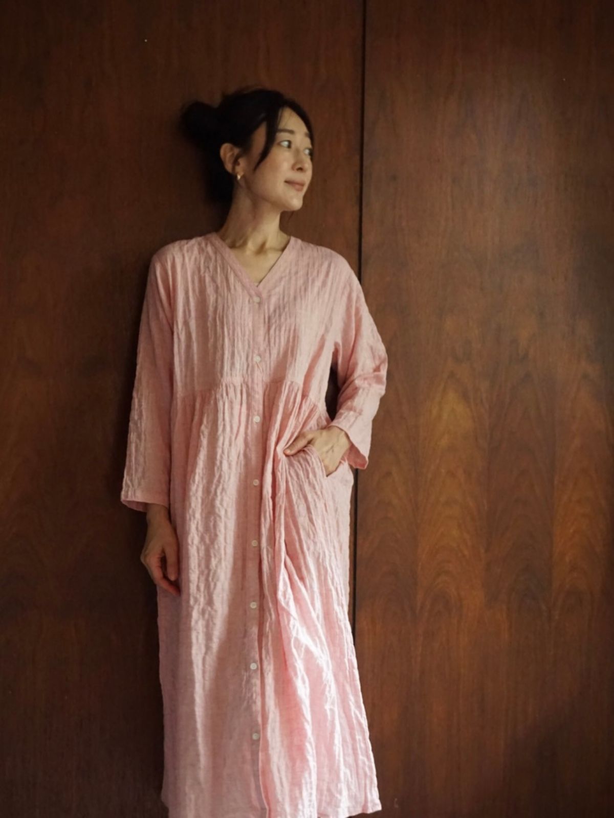 軽やかなのオーガニックコットンワンピースは、ボタンで前開きになるので、羽織りとしても◎