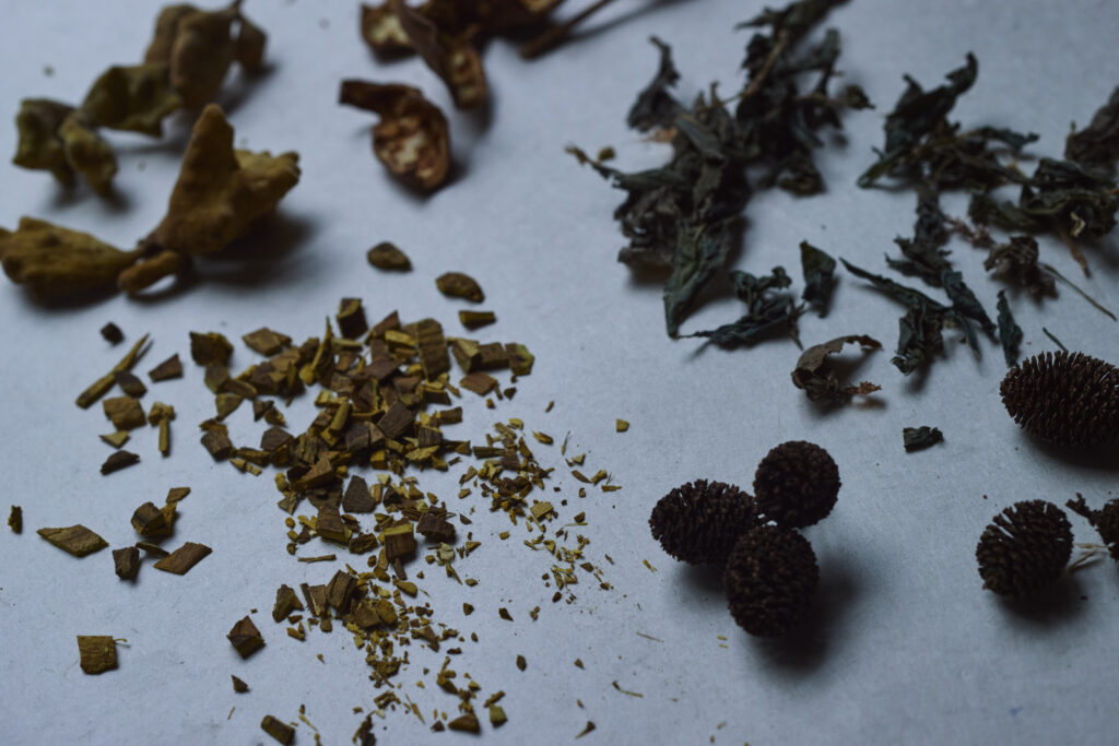 私たちのオーガニックコットンは優しさと柔らかさが特徴ですが、この草や木の枝など色をまとうと、肌により力強いエネルギーを伝えてくれます。