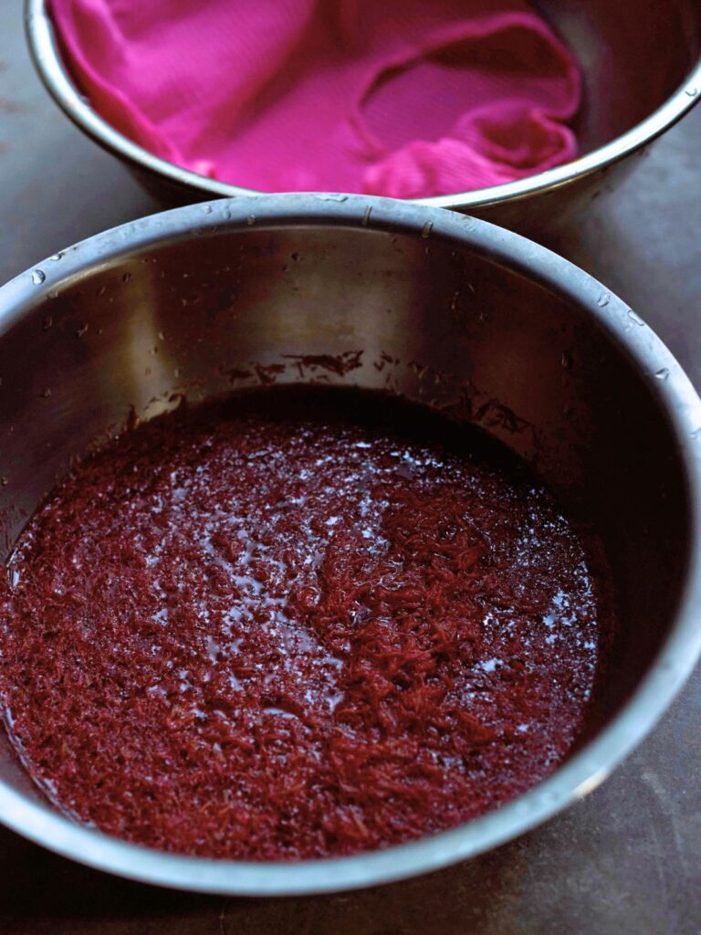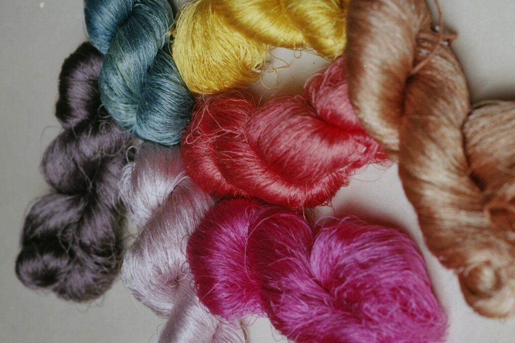 今回は、紅花や茜など、自然が生み出す染料から一点一点、丁寧に染め上げていただきました。