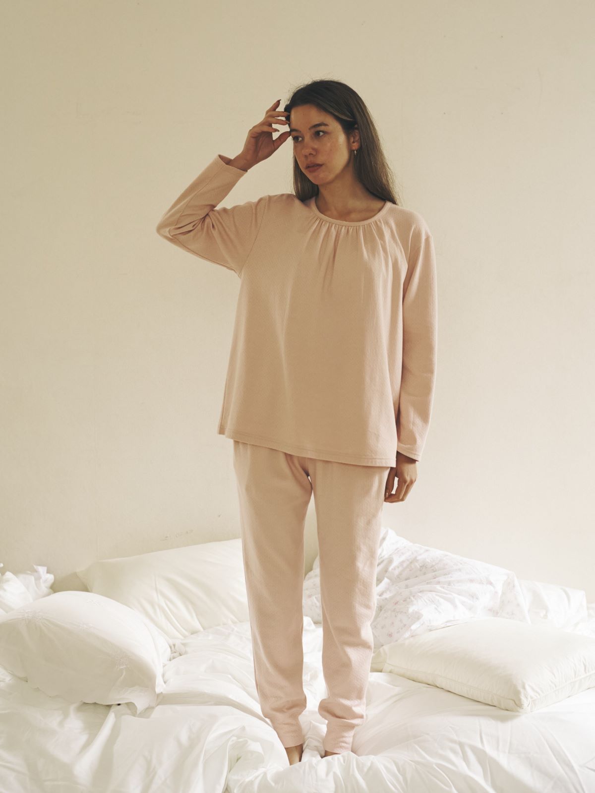 レースやワンピースが苦手という方にもスズランの心地よさを体感いただけるように、シンプルなクルーネックのパジャマトップスを。