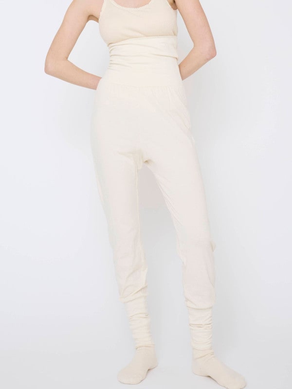 胸下までくる腹巻きが付き、足首もしっかりとあたためる仕様の腹巻きレッグパンツ。